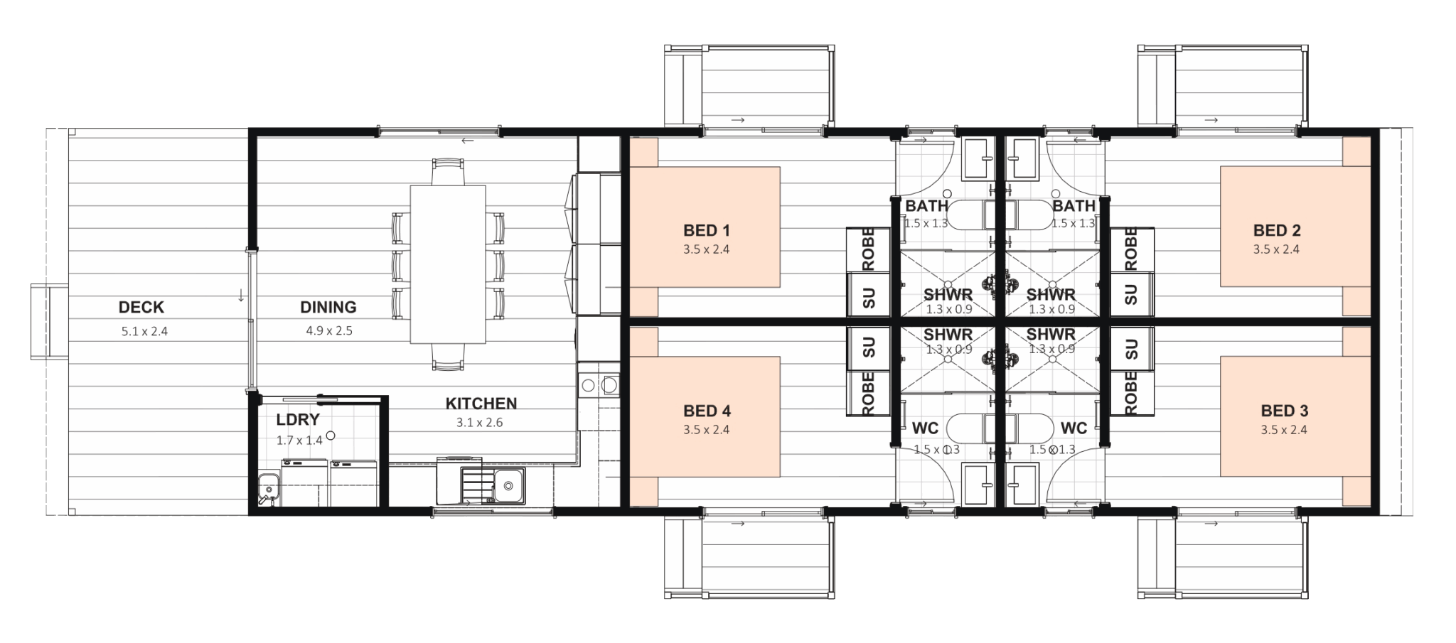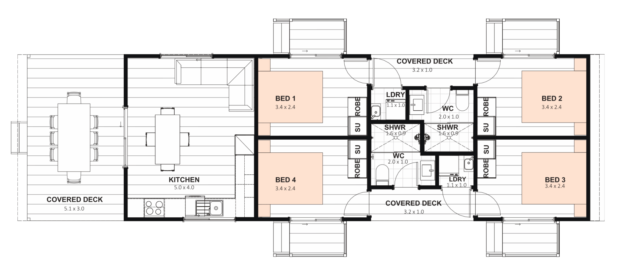 Designed for flexibility, the Rivergum offers private, lockable bedrooms with their own external access – ideal for shared worker living. With a separate kitchen, dining, and laundry hub, it gives every occupant their own space while still fostering connection. Available in multiple configurations, the Rivergum balances privacy and practicality in one smart, compact footprint.